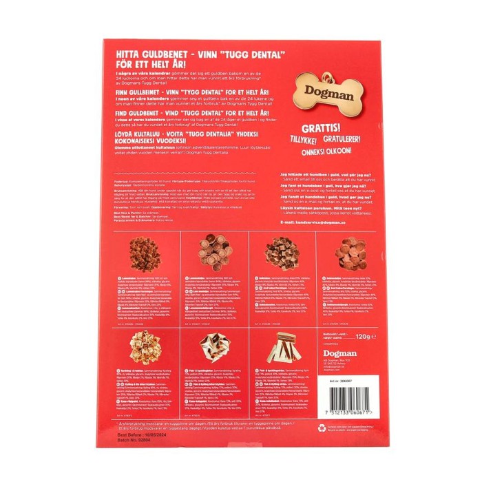 Räkna ner till julafton tillsammans med din hund med Dogmans adventskalender. Bakom varje lucka väntar smaskiga överraskningar som kommer att glädja din fyrbenta vän. Med lite tur hittar ni även det gyllene benet, vilket ger chans att vinna Tugg Dental för ett helt år. Kalendern är fylld med både glädje och godsaker – den perfekta presenten för att sprida julstämning till hela familjen!