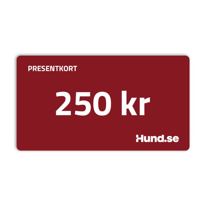 Ett presentkort från Hund.se är alltid välkommet. Köp presentkort via vår hemsida, vi e-postar sedan ett presentkort (som .pdf-fil som ni kan skriva ut om ni vill) till er med en unik kod som ni kan använda som betalning via hemsidan.
