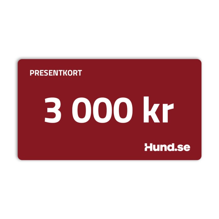 Ett presentkort från Hund.se är alltid välkommet. Köp presentkort via vår hemsida, vi e-postar sedan ett presentkort (som .pdf-fil som ni kan skriva ut om ni vill) till er med en unik kod som ni kan använda som betalning via hemsidan.