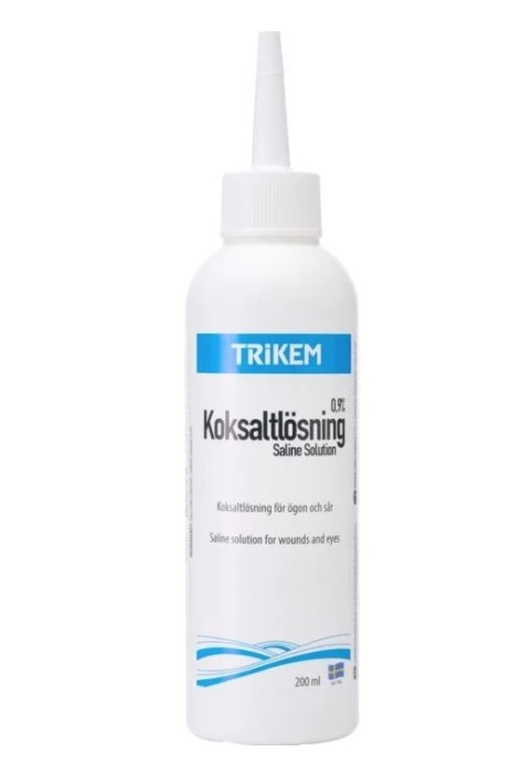 För sårrengöring – rikta pipen mot såret och tryck hårt på flaskan för att få en kraftig spoleffekt. Alternativt kan du fukta en bomullstuss med koksaltlösningen och använda den för att rengöra såret.
